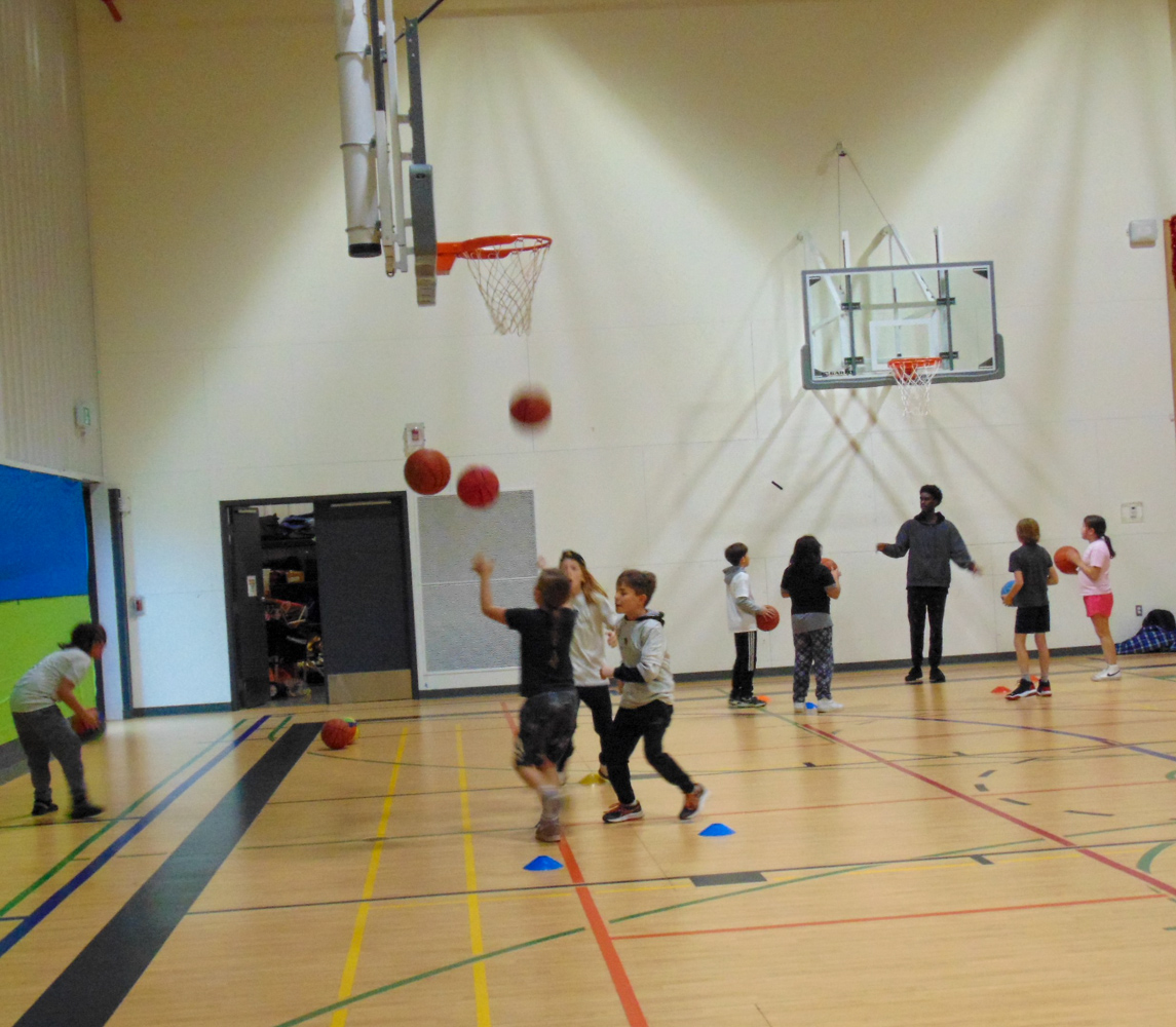The program began with kids between the ages of nine to 12. With demonstrations of lay-ups, dribbling, passing and general rules of the game, the coach and his two assistants let the players work at developing their skills for about an hour. Organized chaos was how it appeared to the casual observer, but clearly a great deal of fun was part of the agenda. After an hour-long instructional period, the small athletes were divided into three groups and each team donned a different colour of jersey – red, black or white. For five minutes per game, the red jerseys played the black, the black jerseys played the white and then the white jerseys played the red, all the while learning to pass, dribble, stay within the boundaries of the court and, sometimes, score a basket.