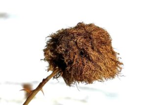 Larvae of rose gall wasps stimulate the leaves into becoming large hairy masses varying in size from olives to oranges. Galls are green to red while growing, but turn brown in the fall. Large galls can contain up to 50 larvae, all of which turn into adults the following spring and chew exit tunnels to the outside.