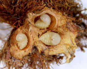 The immature, legless larvae spend the next 51 weeks within individual small chambers near the centre of the gall waiting to detect just the right conditions to turn into adults and search for new plants to lay their eggs.