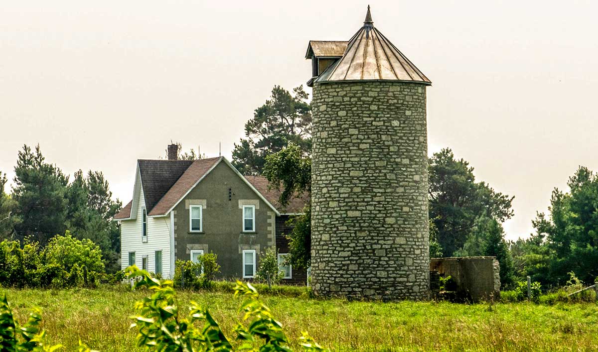 From Hwy 540 at Gore Bay, turn south onto Poplar Road; the farms start here, many still owned and operated by descendants of the original settler families. A unique stone silo at “the old Willett place,” now unused, stands like a monument to perseverance, crafted by local stonemasons Stewart Clarke and his son, Stewart Clarke Jr., in the 1920s.