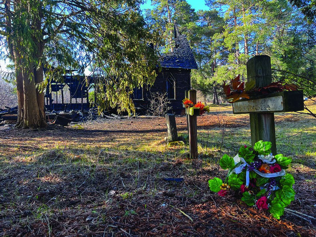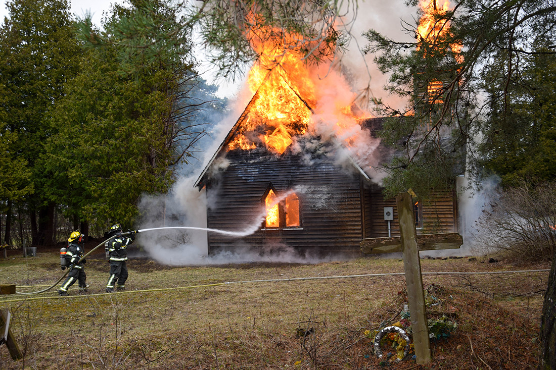 HISTORY AFLAME—The former St. Andrew’s Anglican Church in Sheguiandah First Nation was destroyed in a conflagration that threatened to spread to the nearby bush during the afternoon of Friday, April 19. The building had lain derelict for a number of years and was uninsured. UCCM Police are investigating the incident. photo by Michael Erskine
