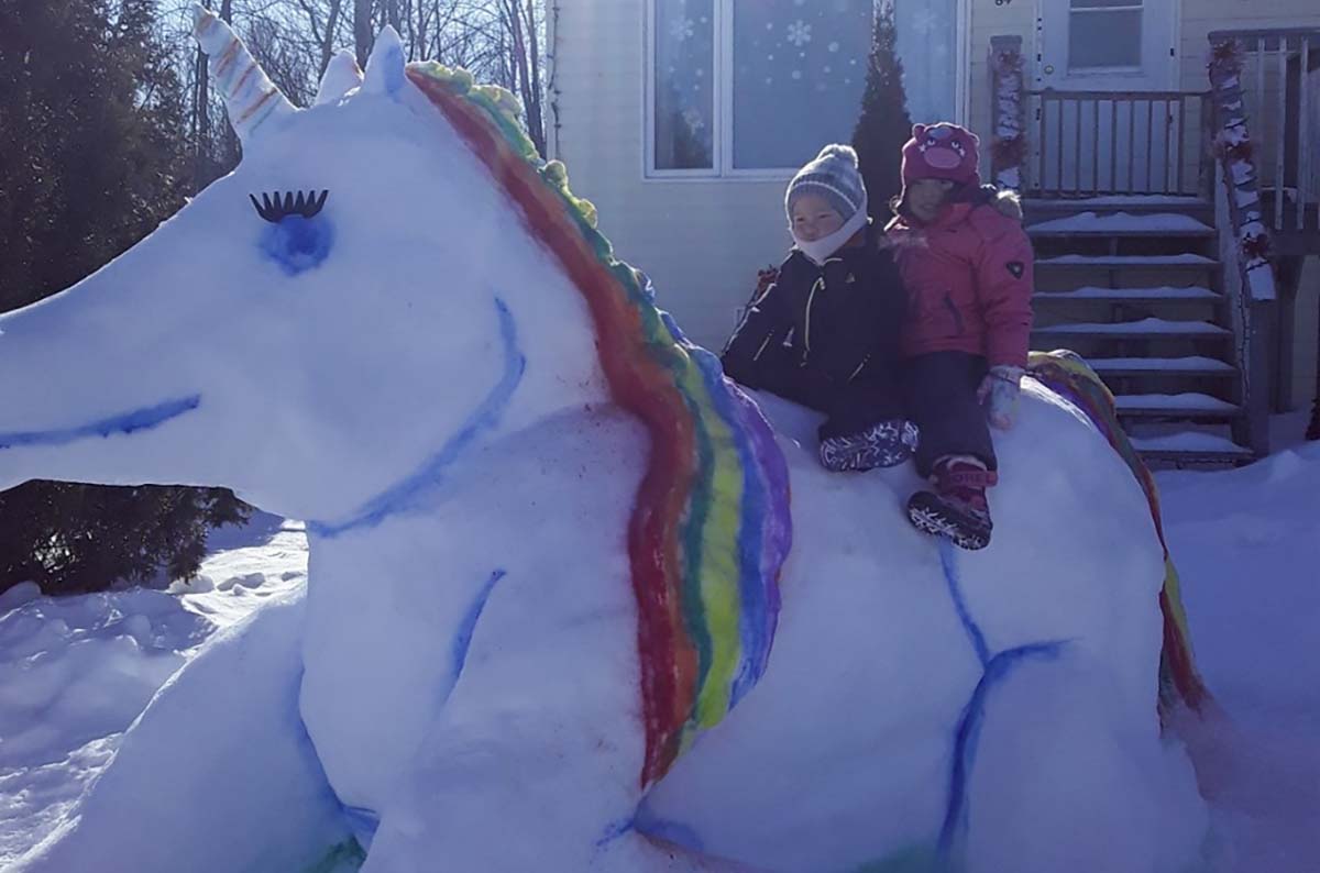 First place of $100 (sponsored by the Northeast Town) went to William Quinn and the Quinn Family of Gore Bay for their Charlie Brown and Snoopy snow sculpture. Second place of $50 (sponsored by the Municipality of Central Manitoulin) went to Maureen Nahwegabo and family of Aundeck Omni Kaning for their unicorn snow sculpture and third place of $25 (sponsored by the Township of Assiginack) was secured by the Bowerman family of Central Manitoulin for their Jack-o-lantern snow sculpture.