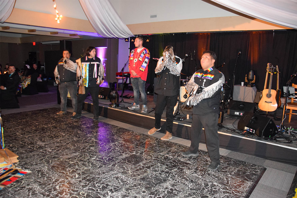 Once assembled in the main hall, emcee Bobby Hudon guided evening’s events that began with a traditional opening including a drum song by Mushkway Gaabo and performance by Tim McGregor and friends in full jiingtamok regalia and a prayer.