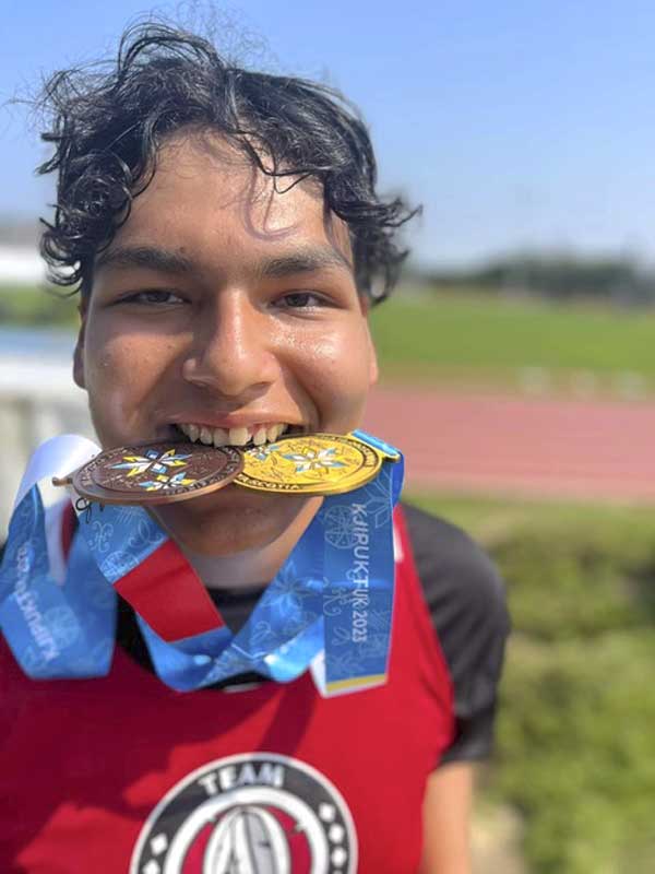 Xavier Aguonie-Fox also of Sheguiandah First Nation was the strongman in athletics with a four-foot margin to win Gold in the shot-put. Xavier was also active in the high jump and relays.