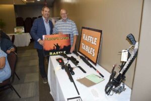 The gun raffle was also a big hit, with Rob Marshall taking home his choice of three firearms or a compound bow. Manitoulin Streams director Bob Florean was kept busy selling tickets, while vice-president Brian Ramakko had the honour of presenting the prize. The hunting tool of Mr. Marshall’s choice will be held at Ramakko’s Source for Adventure in Sudbury until transfer documents are completed.