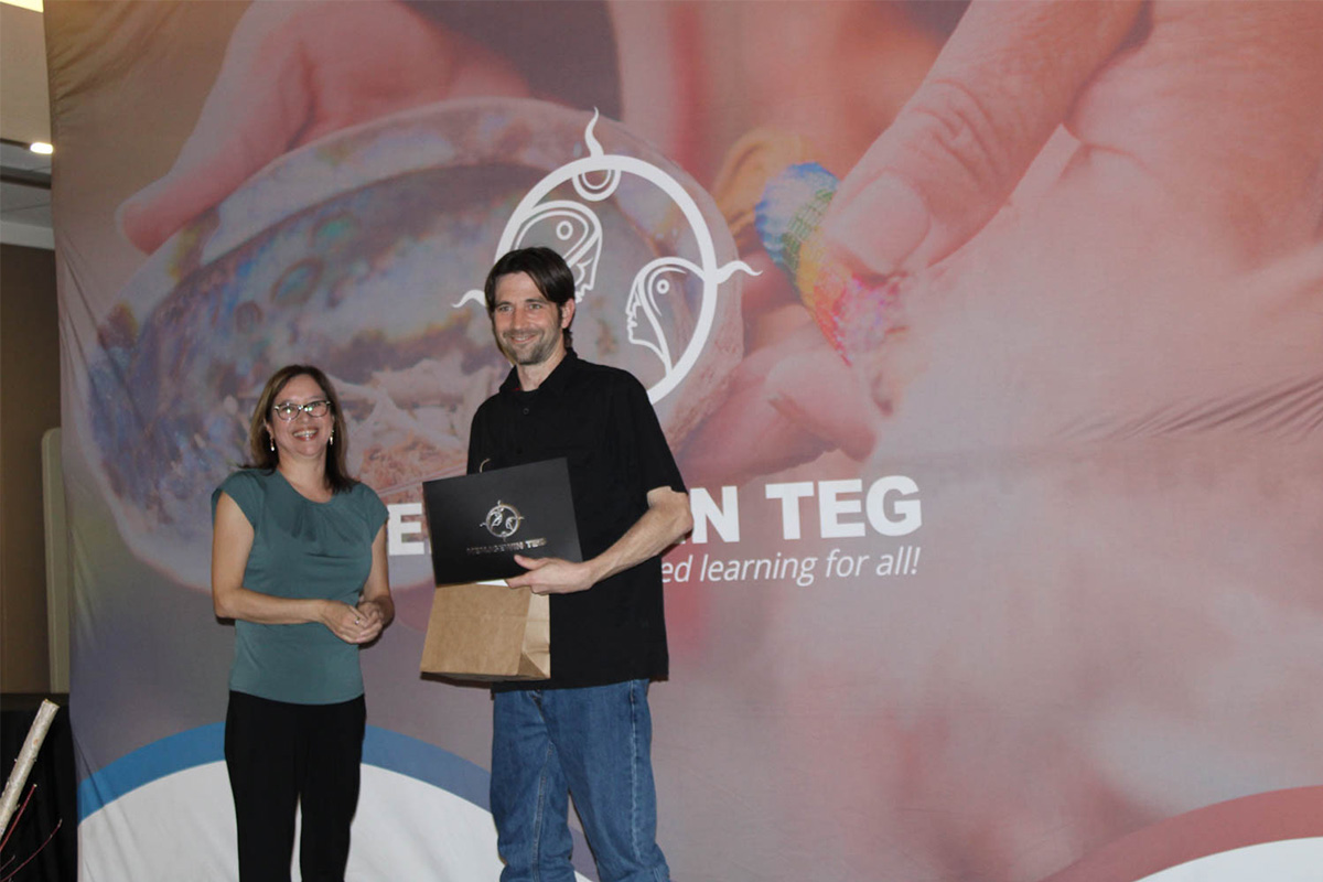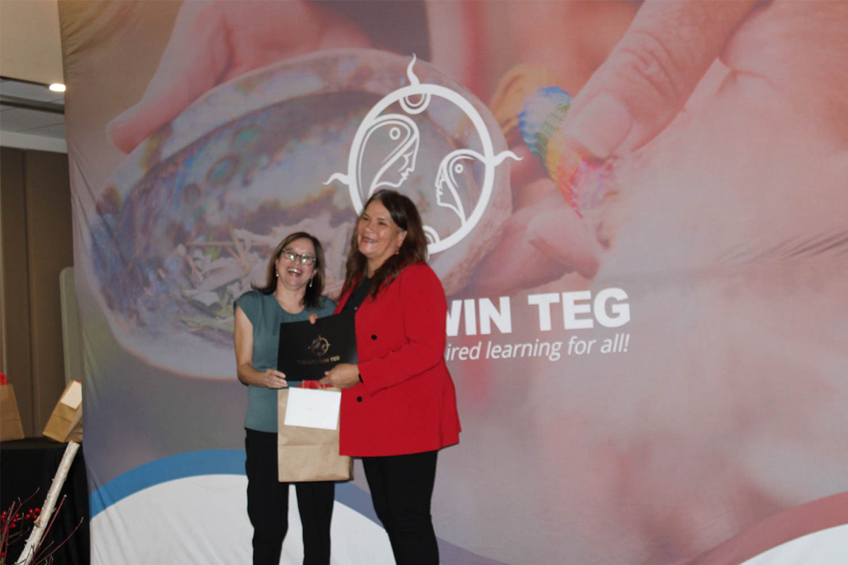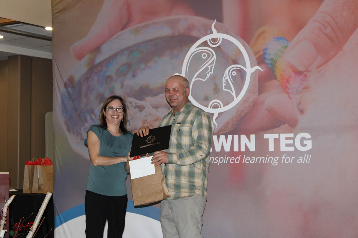 Rhonda Hopkins, teaching and learning professor of Anishinaabemowin was also recognized for having recently received her Honorary Doctor of Laws from Queen’s University. She was presented with a floral arrangement and gift from the Kenjgewin Teg staff and board.
