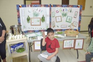 Young Edison proudly explained the many important properties of the sacred medicine giizhik (cedar) in great detail and had plenty of cup of delicious and healthy cedar tea on offer to visitors at his booth.