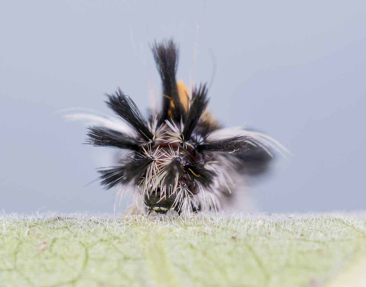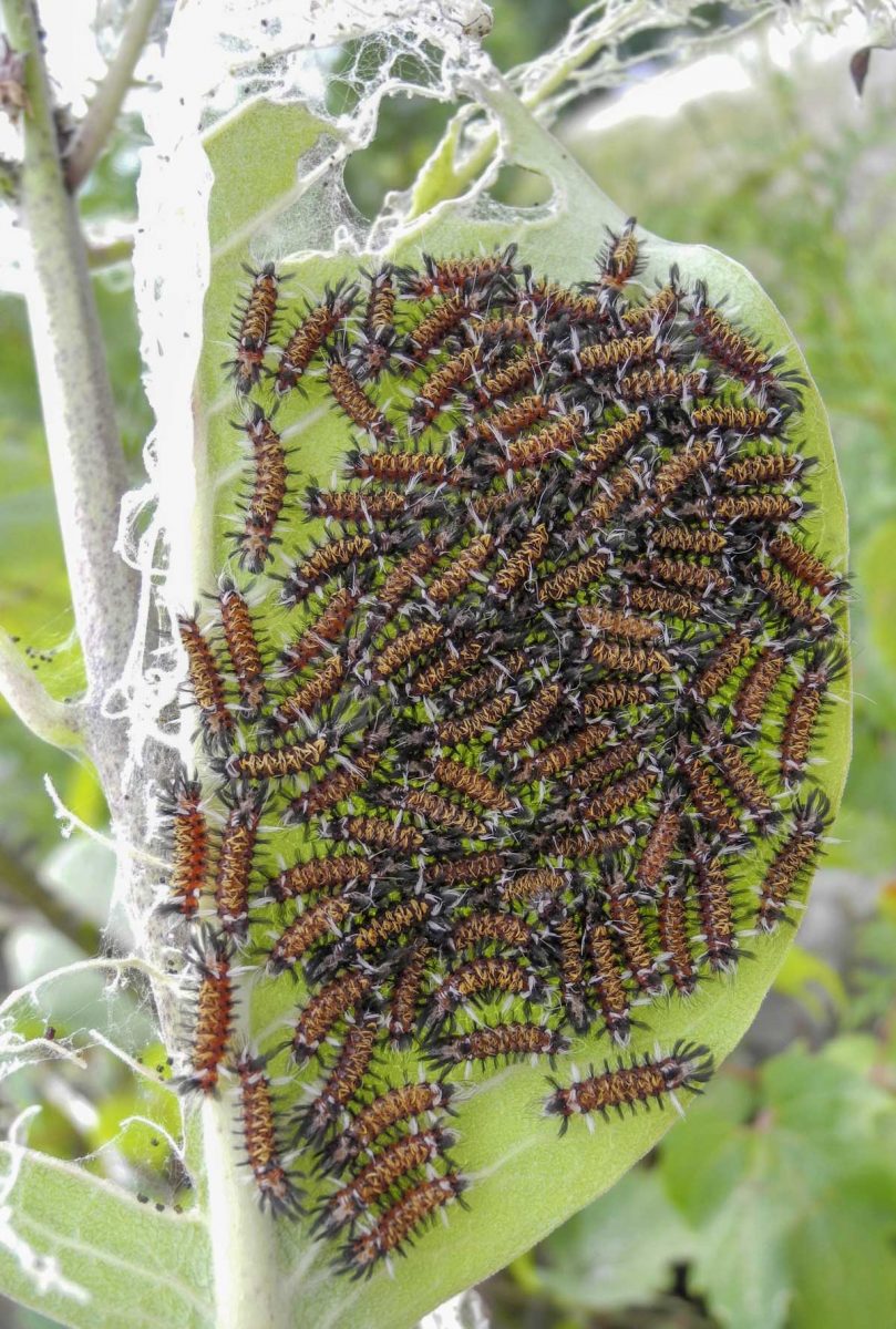 In contrast to solitary monarch caterpillars, freshly hatched tussock caterpillars start life feeding with their siblings in dense herd-like clusters.