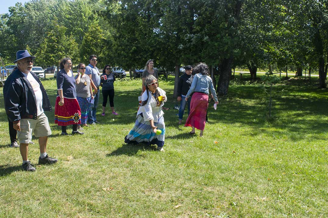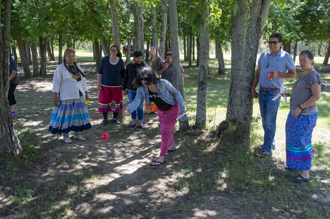At the camp, the staff broke up into three groups that circulated to the various stations. Two stations would be hosting games and a third would involve a cultural teaching session. One of the game stations featured Anishinaabemowin darts—whatever number the players hit, they would have to say its name in the language. As they threw their second, they would have to add the numbers and continue reading them in Anishinaabemowin.