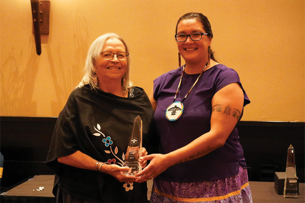 Marjorie Trudeau of Wiiikwemkoong Unceded Territory received an Anishinabek Lifetime Achievement Award in the category of culture. Her award citation reads, “serving as a volunteer board director for Debajehmujig Theatre Group for over 40 years, she has been instrumental in the growth of the theatre group, from their start as a seasonal operator in a church basement to being a full-time operation in a facility. Not only has she worked tirelessly behind the scenes, but she has also performed in several productions.”