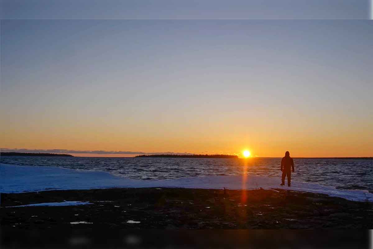 Mr. Beauchamp’s Manitoulin camping experience was enhanced by the generosity of his cousin’s neighbours, providing him locally sourced foods to eat, bear bacon and venison sausage, along with his cousin’s sourdough naan. He was given a local author’s history book to read, one which referenced the very spot upon which he camped. He was hoping to capture the harshest of winter conditions but his first day here was 12º C. As the days progressed, “It was absolutely freezing! The tarp was weighed down with snow and the condensation from my breath turned to water that dripped on my sleeping bag. It was pretty miserable,” he said, laughing, then added, “I really loved Manitoulin Island. The scenery is beautiful… but the people are truly amazing as well, very sweet and generous, unlike anywhere else.”