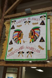 “Today’s opening of this quilt exhibition Zaagidowin gii-dgowngaade (made with love) is made up of the works of quilters in four communities on the Island, Wiikwemkoong Unceded Territory, M’Chigeeng First Nation, Zhiibaahaasing First Nation, and Birch Island,” said OCF curator Shaelynn Recollet. “The majority of the 17 quilts are hand made and not using a machine.” The list of quilts includes quilts from OCF’s permanent collection.