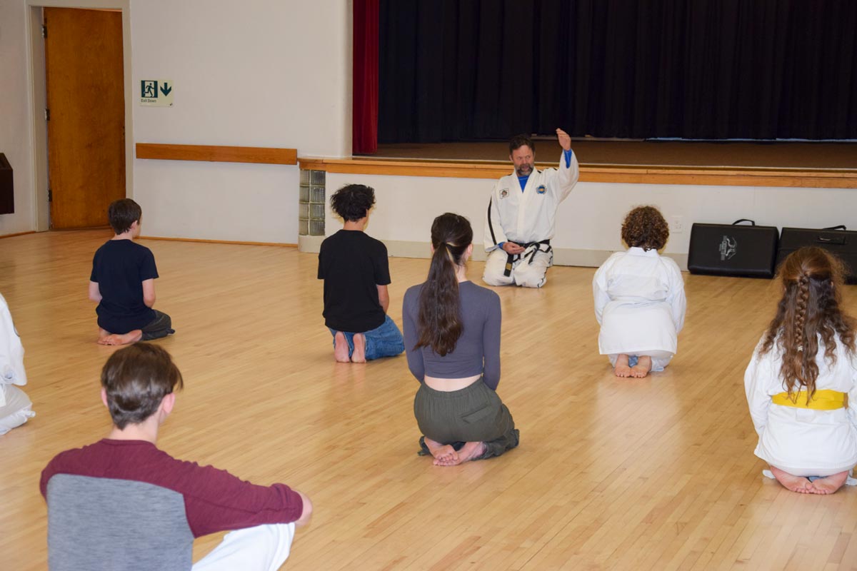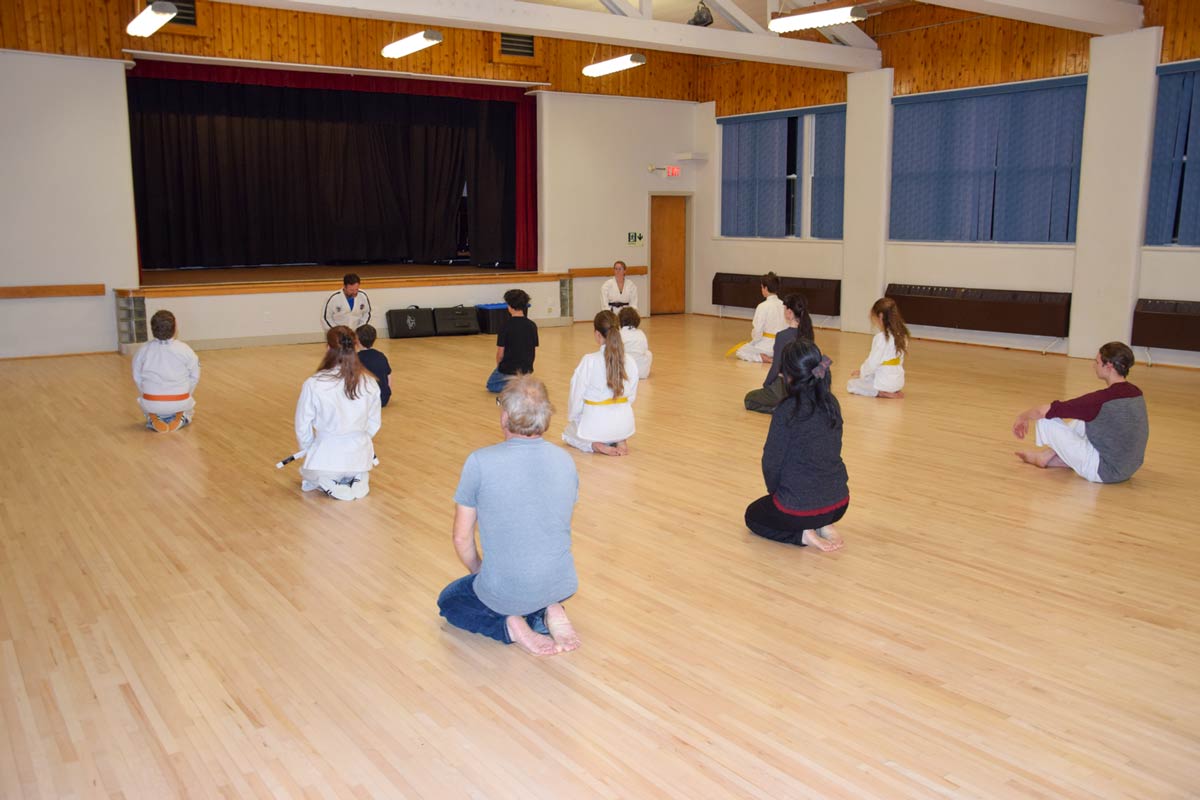 No wet or dirty footwear is allowed. “Slippery floors lead to injuries,” cautioned Master Alvey. “If you have bare feet, make sure your nails are trimmed.”