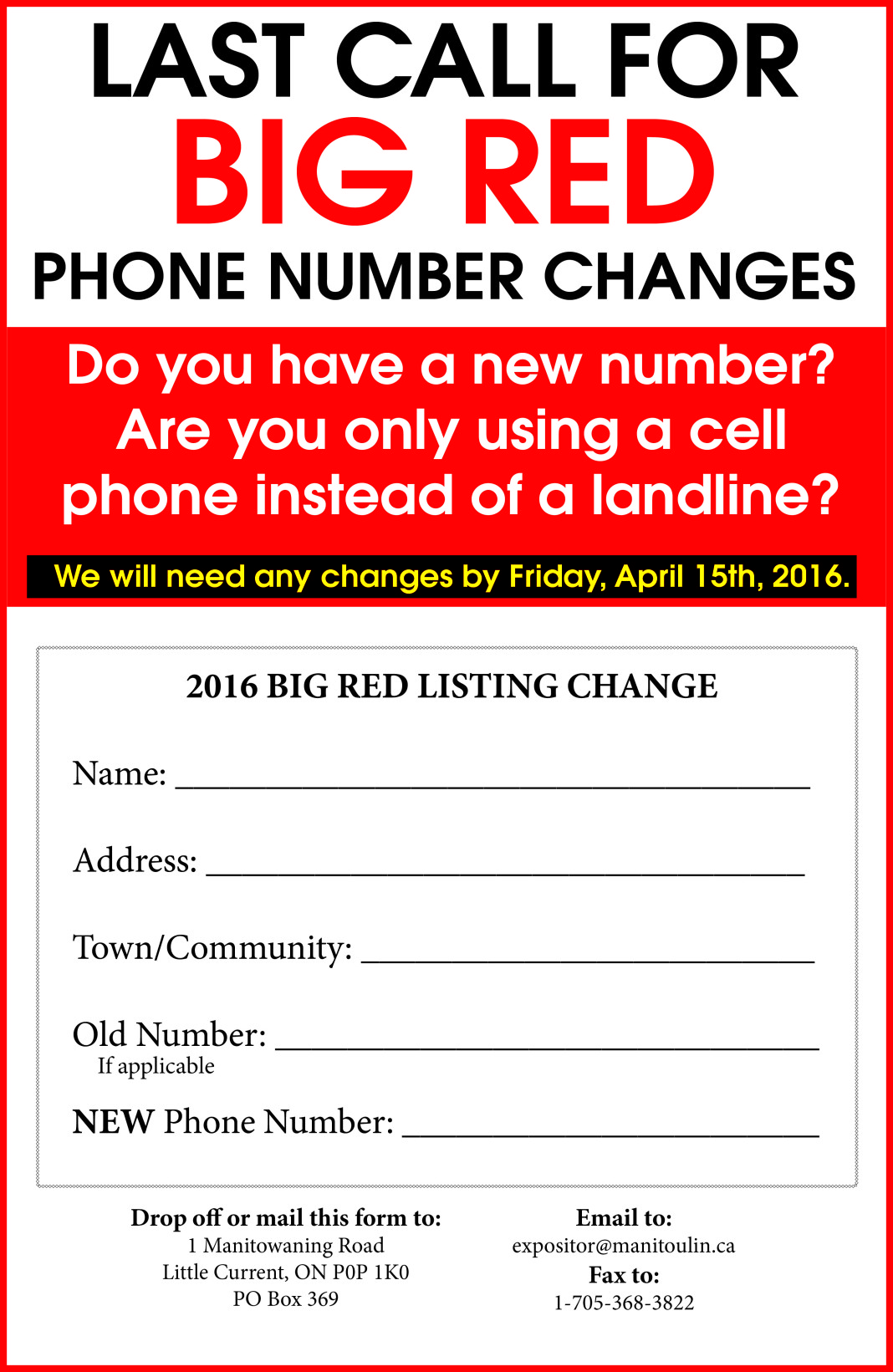 If this describes what you have done and if you live on Manitoulin Island, we want you to send us your new cell phone number so we can include it in the new edition of Big Red.