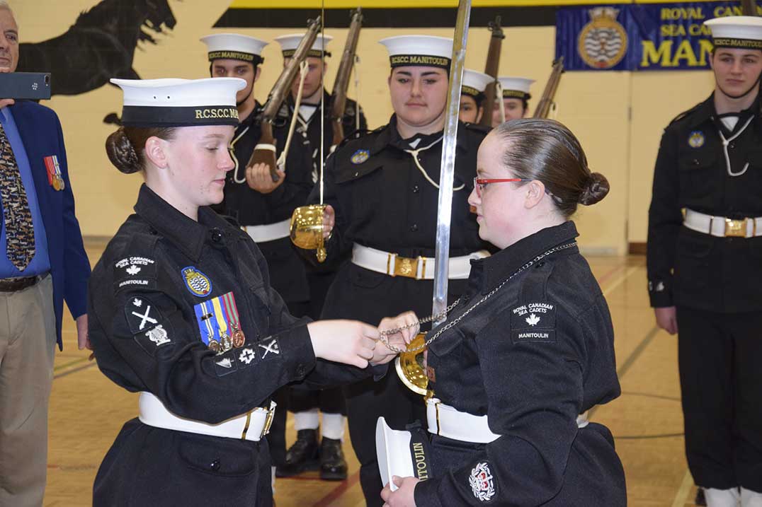 M’CHIGEENG – A rollercoaster of emotions was evident during the 2019 Annual Review of the Royal Canadian Sea Cadet Corps Manitoulin as the corps not only observed the passing of Navy League of Canada (Ontario division) president Barry Bevan but the retirement of the corps’ most senior cadet officer and coxswain, CPO1 Miranda McKay, complete with a ceremonial handing over of sword and whistle.