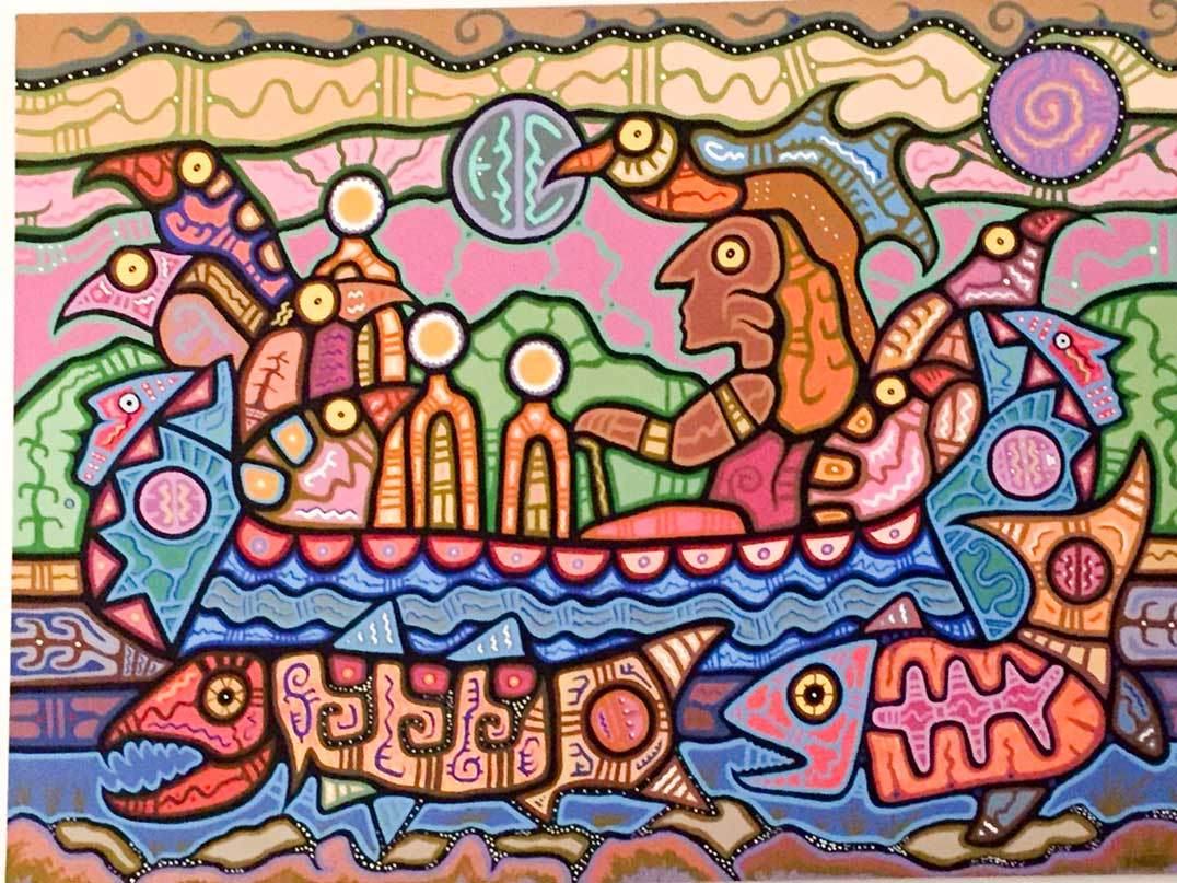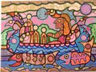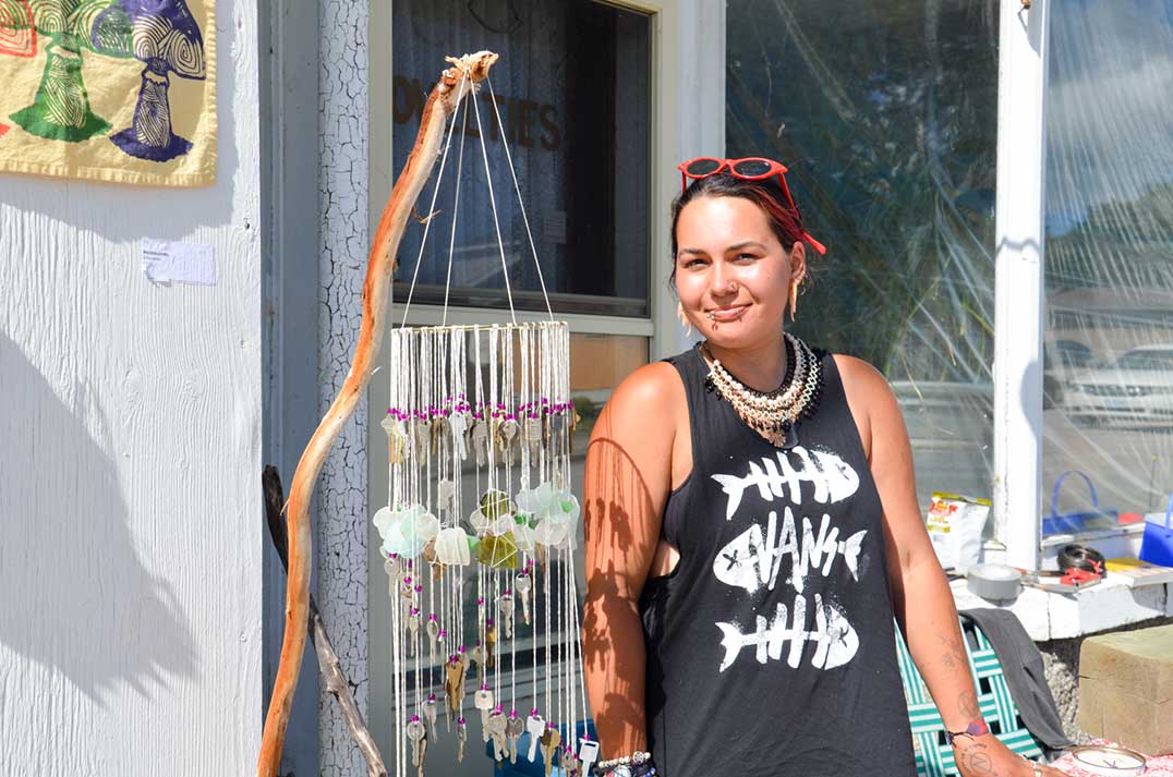 A little way up the road in Manitowaning, Mira Jones represents a younger up-and-coming artist. A found art piece, featuring beach glass and an amazing assortment of orphaned keys woven into a marvelous found art mobile was set up outside the Debajehmujig Creation Centre along with a range of Ms. Jones’ watercolours, photography, sculptures and jewellery.