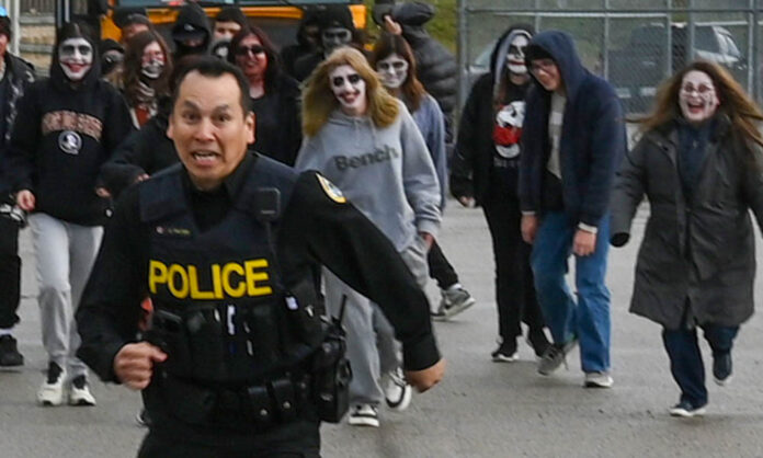 Karen Noble, right, displays a purple ‘Wrapped in Courage’ scarf she received for making a donation to Manitoulin Family Resources at the table manned by Colleen Hill at the M’Chigeeng Christmas Market November 4. Ms. Hill explained, “We are raising awareness that November is Women Abuse Prevention Month, providing education and information on the issue. We will be at various events across the Island and we encourage people to visit us at our table and talk to us about the issue. In November we will be focussing on the issue of intimate partner violence.”