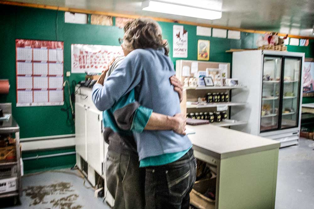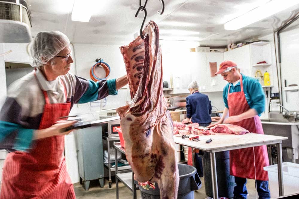 Every once in a while Mr. Hayden helps Mr. Burt with chopping meat, a crucial operation for the retail store and the entire farm. The idea is not waste anything. The fat is an incredible source of bio-diesel, essential to run all the farm tractors.