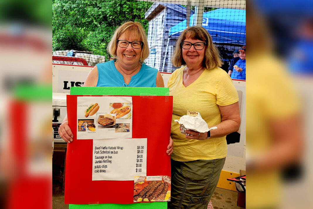 Charlene Chambers (left) and Diana Zieleniewski sold jumbo hot dogs, schnitzel and cold beverages at the St. Johns Anglican Church (Kagawong) annual gigantic yard sale, barbecue and bake sale last Saturday.