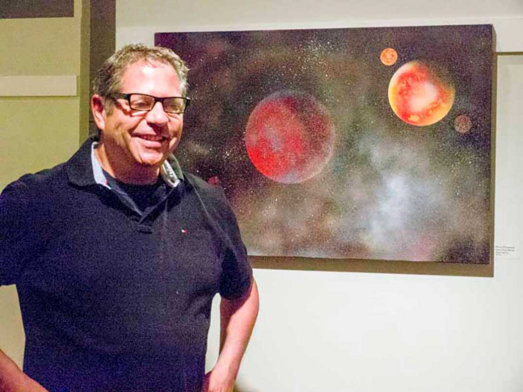 ‘Outta This World’ is “just experimenting,” notes the artist, who used spray paint to depict vivid planets in a black sky filled with galaxies. Mr. Patterson takes pains to detail his process, seemingly still amazed at how much fun can be had painting. “Ideas change. I often get a vision of what I want to paint, but it rarely turns out that way. Ultimately, I want to be satisfied with what I’ve done when it’s finished.”