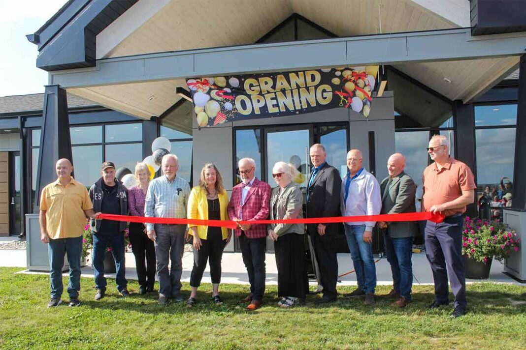AIRPORT TERMINAL OPEN! Taking part in the ribbon cutting ceremonies last Saturday for the new air terminal building included Roger Morrell for the municipality of Burpee and Mills, Tim St. Amand from the municipality of Central Manitoulin, Nancy Richards, Ron Lane for the town of Gore Bay, Carolyn Campbell of LAMBAC, Robert Colwell manager of the Gore Bay-Manitoulin Airport, Carrie Lewis of Gordon/Barrie Island, Lee Hayden, president of the Gore Bay Airport Commission, Dan Osborne of the Town of Gore Bay, MPP Bill Rosenberg and Cliff Barnes of Manitoulin Transport who all took part in the ceremony. Please see story on Page 3.