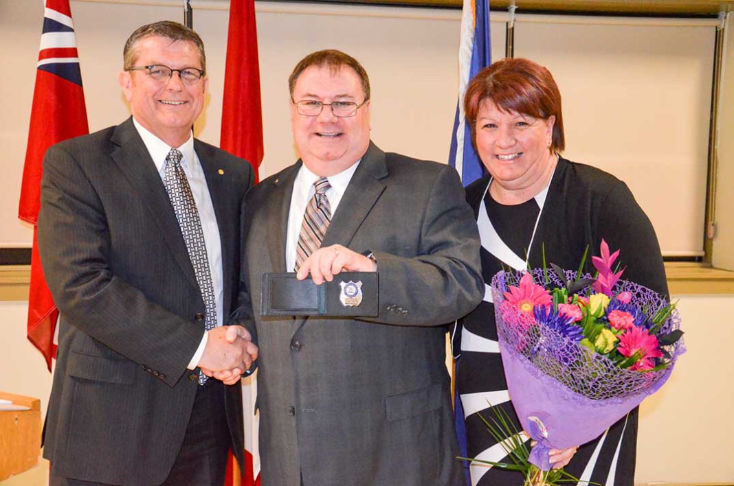 Staff Sargeant Kevin Webb presented the retiring police officer with his retirement badge on behalf of the OPP, as officers surrender their warrant badges upon retirement, and Constable Rob Mellan presented Mr. Boyd and his wife Judy with watches on behalf of the Ontario Provincial Police Association.