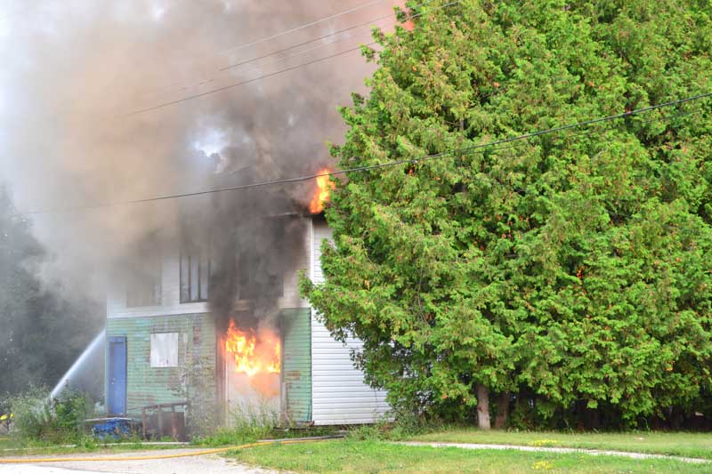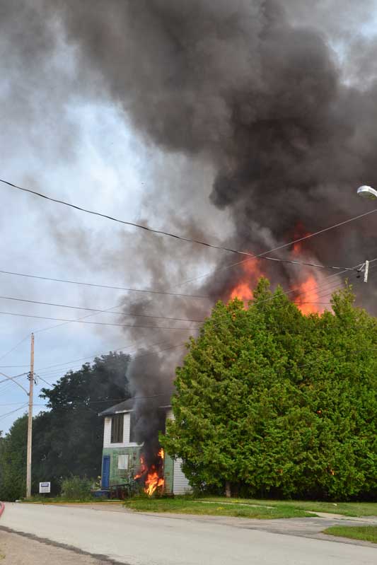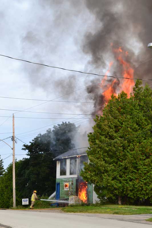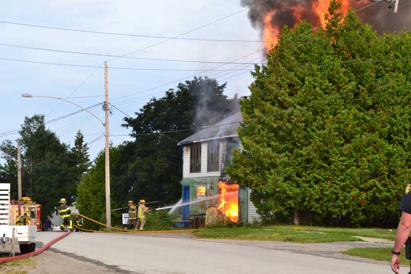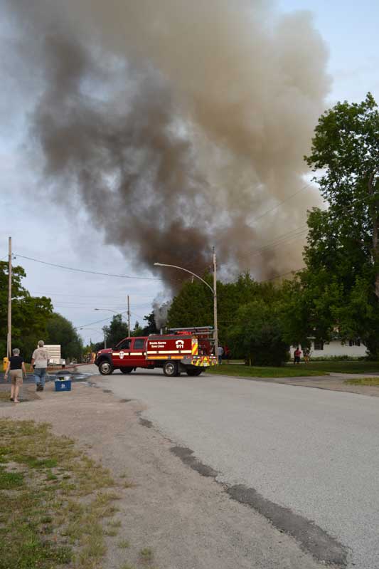 This evening, Thursday, at approximately 6:45 pm, fire crews responded to a fire on Campbell Street West in Little Current where they remain on scene. This time a fire was set in the former curling rink, now a large storage facility owned by JR Renton of Little Current. Inside were at least three vehicles, mechanical items and two large propane tanks. The building is fully engulfed, with crews from both Little Current and Aundeck Omni Kaning working to calm the blaze and keep the neighbouring buildings from catching fire.
