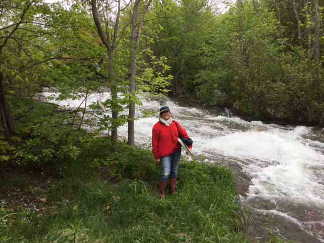 NORTHEAST TOWN—Paulette Stewart carries her painting equipment to a viewpoint alongside Bass Creek waterfalls. She is part of a group of “en plein air” artists who paint or draw outdoors at scenic locations around the Island. They were at this dramatic spot on May 31.