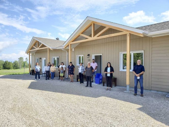 AUNDECK OMNI KANING – Members of Aundeck Omni Kaning (AOK) joined Ogimaa-kwe Patsy Corbiere and band councillors in a brief ceremony to commemorate the opening of a six-plex housing development in the northwest part of the reserve last Thursday, July 16, marking the first build in a new area that already has a long list of interested prospective tenants.