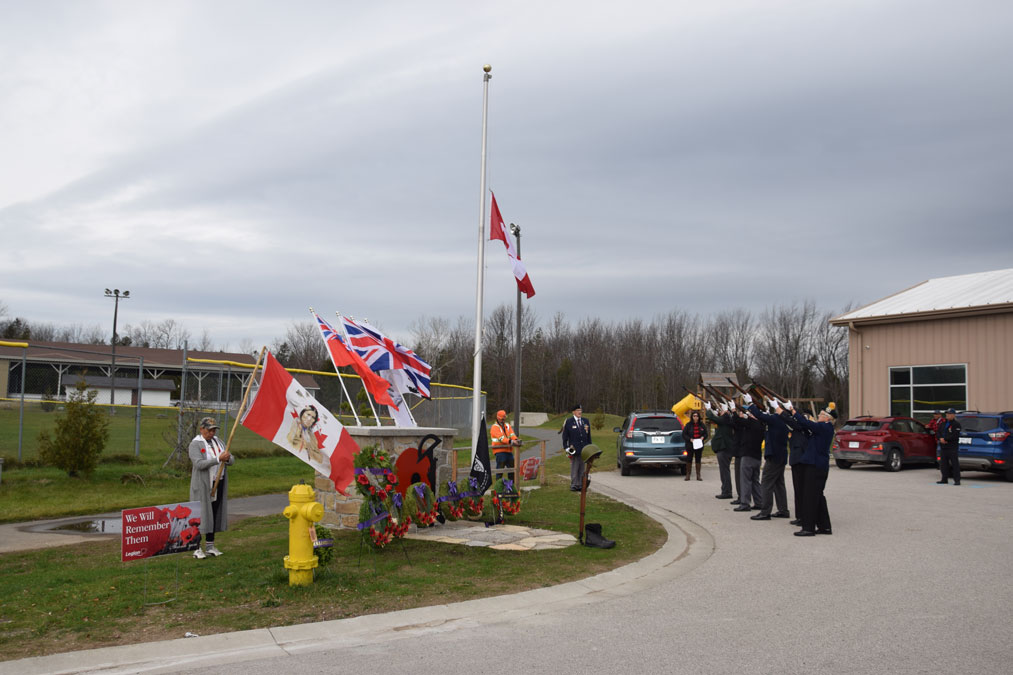 AUNDECK OMNI KANING—A new monumental structure stands sentinel outside the Four Directions Complex in Aundeck Omni Kaning (AOK) First Nation as the community unveiled a new cenotaph on November 11. The Sergeant Golden Silver Star Memorial Rifle Team (adopted by the First Nation as its official rifle team) were on hand to fire a salute as part of the unveiling and Remembrance ceremonies.