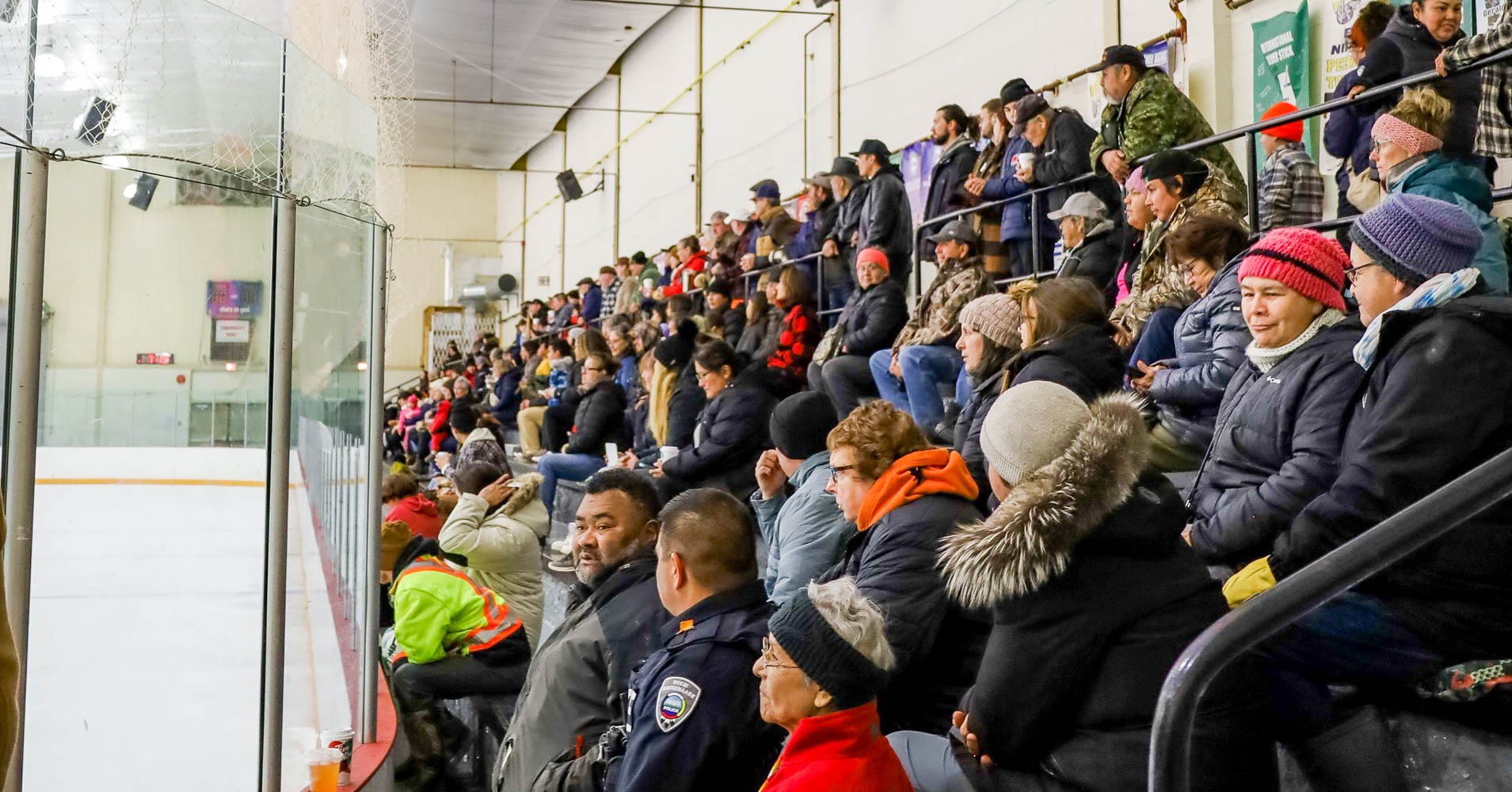 The Battle of the Bridges hockey game took place at the NEMI recreation centre on December 22, pitting the UCCM Anishnaabe Police Service (UCCM APS) against the Wikwemikong Tribal Police Service (WTPS). The UCCM APS won the game handily, but the score wasn’t the key thing—it was the huge crowd that attended the game and who donated a large amount of non-perishable food items to be given to those in need that really mattered.