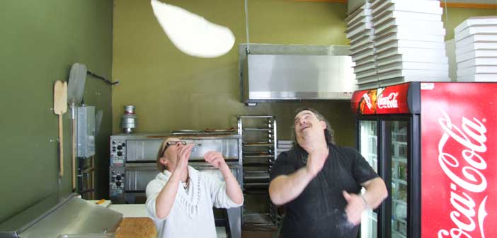 LITTLE CURRENT—Michael Lazzarino tosses a disk of pizza dough high into the air above his head, spinning it into the delicate thickness that is characteristic of a true Napoli thin crust pizza.