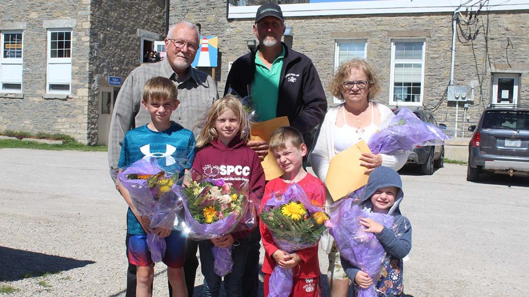 Billings councillor and deputy mayor Bryan Barker presented the 18 and under category awards to four children from the same family. They included David, Sarah, Tommy and Joshua Joyce. David and Sarah helped hide eggs in the annual Easter egg hunt held in Kagawong in April. David gave one of his eggs to a friend who had fewer eggs in their basket, knowing that one of the eggs held the ‘Golden Ticket’ for a basket of goodies.