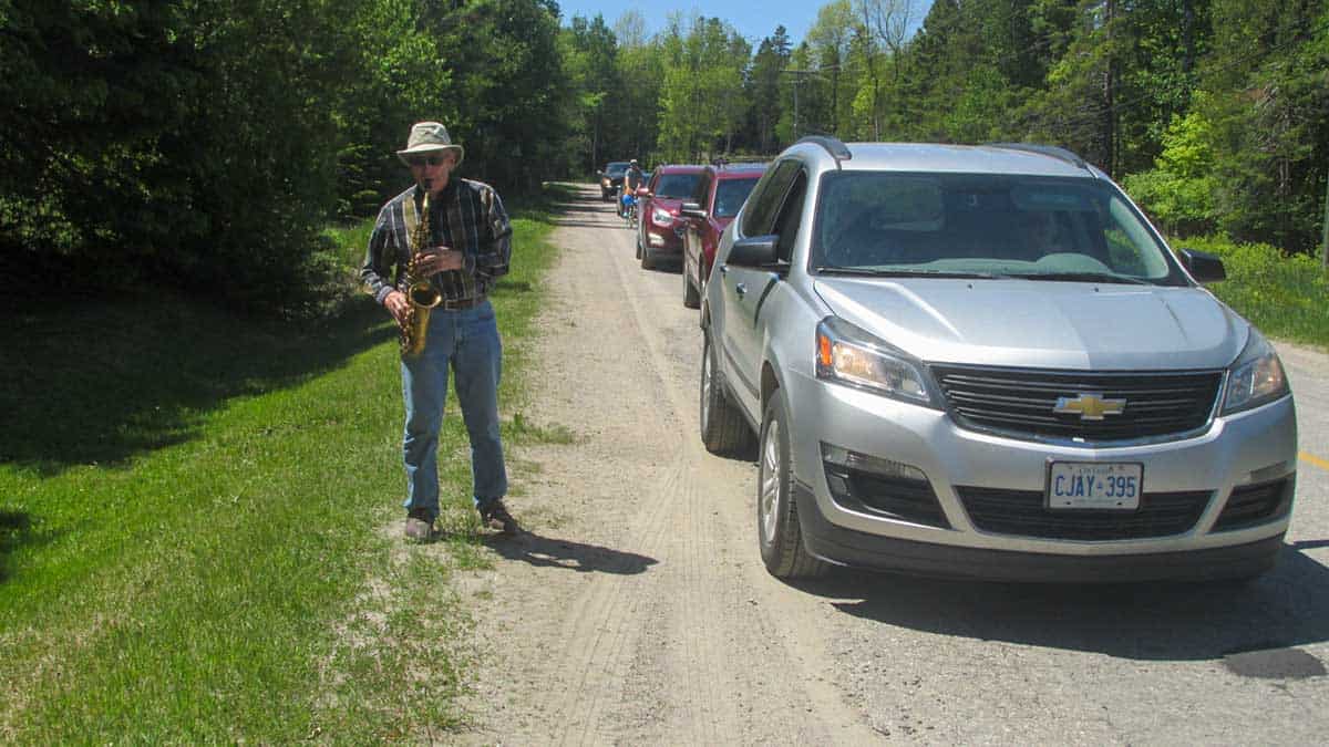 The procession of vehicles, which included Fire Chief Jeff Middleton in the township of Burpee and Mills fire truck, had to number close to 50. One of the groups included Jeff Gilmore and family, along with Peter Carter and Laurie Zahnow in a boat with a large banner wishing Mr. Thompson a Happy 75th birthday and singing ‘Happy Birthday.’ As well, Jim Smith of Mindemoya got out of his vehicle and played a rendition of ‘Happy Birthday’ for Mr. Thompson on the saxophone. Karen Noble was among those who handed over a basket of baked goods for Mr. Thompson to enjoy, and he also received numerous birthday cards.