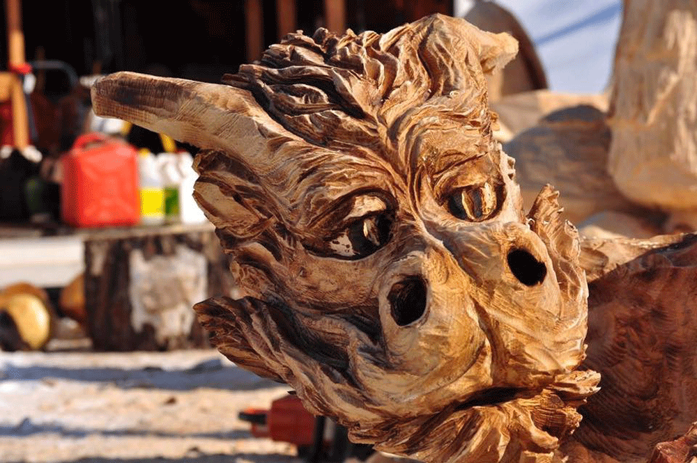 Almost all the carving is done using chainsaws, but there are some hand tools used for the fine finishing work.