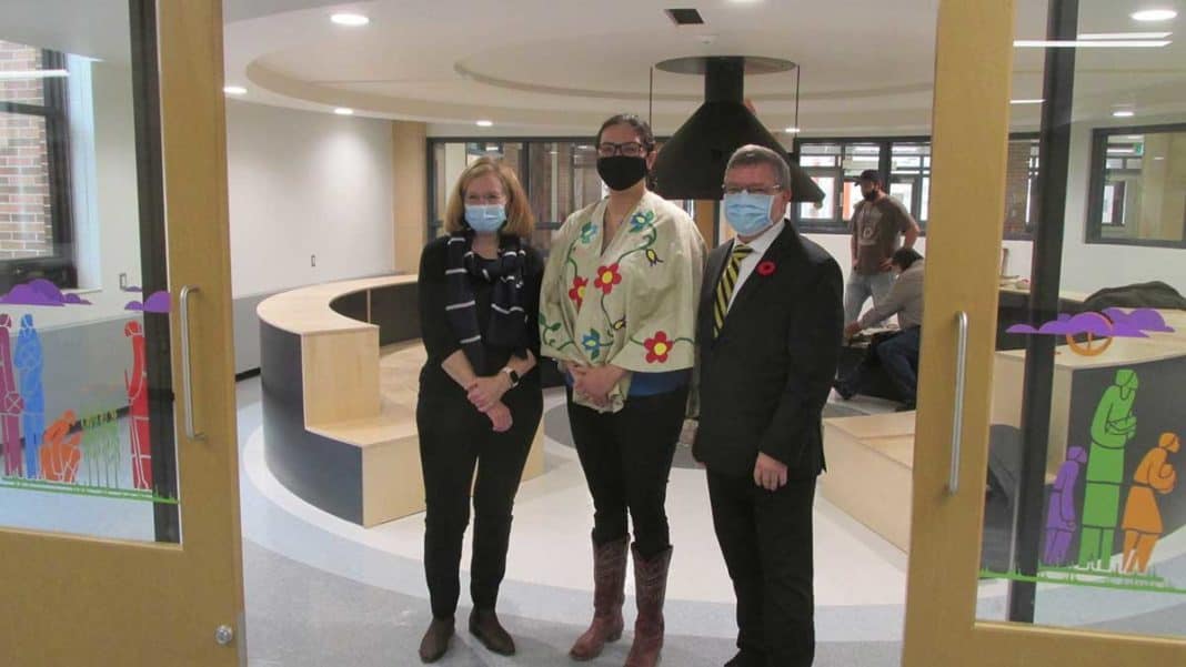 M’CHIGEENG – A small gathering of students and staff at Manitoulin Secondary School (MSS) and representatives of the Rainbow District School Board (RDSB) gathered for the grand unveiling of the wonderful renovations made at the school, including the OneKWE/Kwest sculpture outside the main entrance to the school and the smudge room beside the lobby inside.