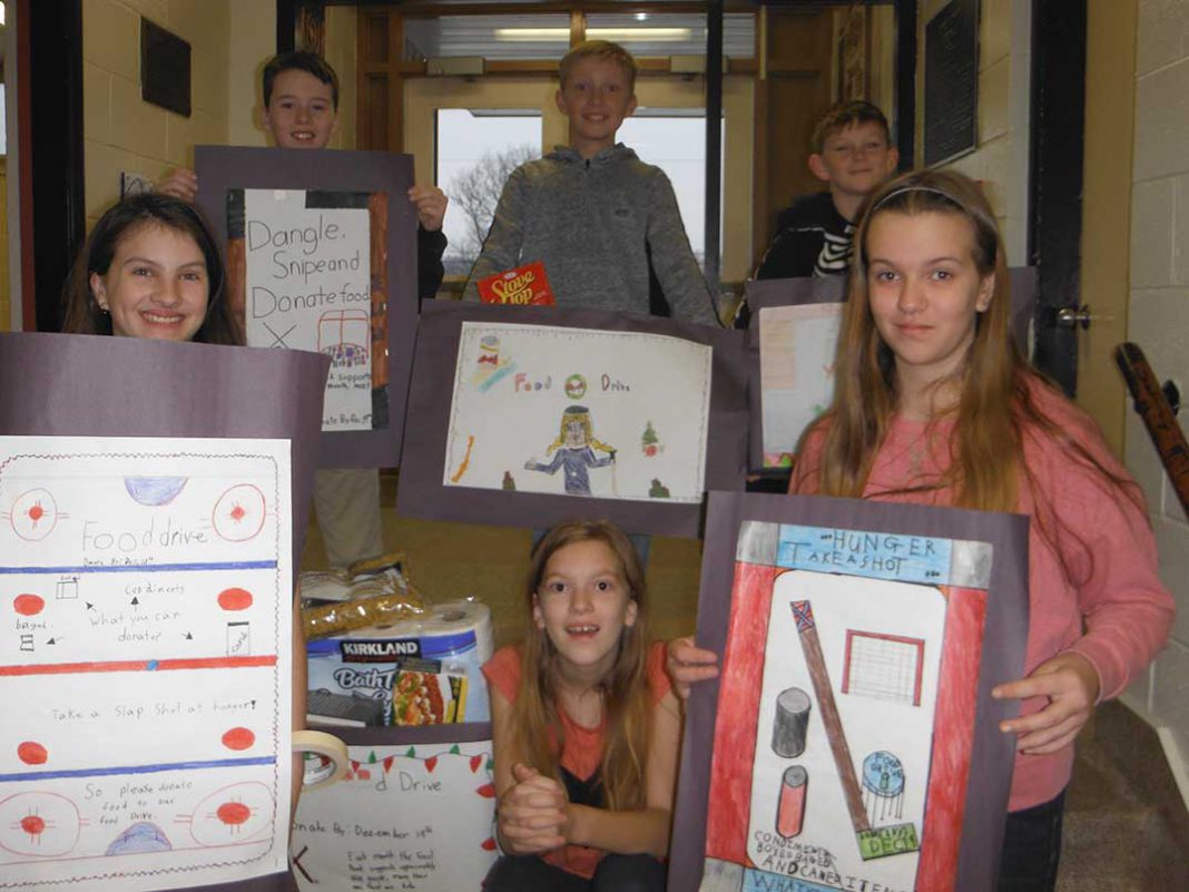 The Grade 5/6 students spearheaded the operation which lasted just shy of two weeks. Ms. Patterson explained the students wanted this year’s food drive to have a hockey theme. Some students created fitting poster advertisements that at were on display around the school which included an eye catching design, a catchy slogan, and an informational fact about the local food bank. Some students wrote motivational announcements which they read over the public address system as part of the daily morning messages at the school.