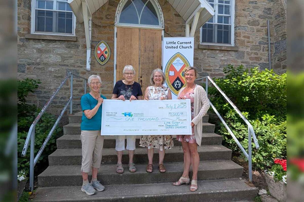 Little Current United Church Pastoral Charge, along with United Church congregations nationally, celebrated the centennial of the United Church of Canada in June. Part of the Little Current United Church’s celebration was a dessert tea in late June where fashions from the past century (and before) were arrayed in the church hall and appreciated by the large attendance. Funds raised that day were earmarked for a donation to the chemo room at the Mindemoya site of the Manitoulin Health Centre, an initiative that had been a work-in-progress by the Little Current United Church Women (UCW) organization just prior to the pandemic that halted events like this. Former Little Current UCW members gathered last week at the church to present MHC CEO Paula Fields, right, with a $1,000 donation collectively raised from the proceeds of the dessert tea and private donation. From left, they are Helen Gordon, Myrna Ferguson and Diana Parrill (who organized the exhibits for the dessert tea).