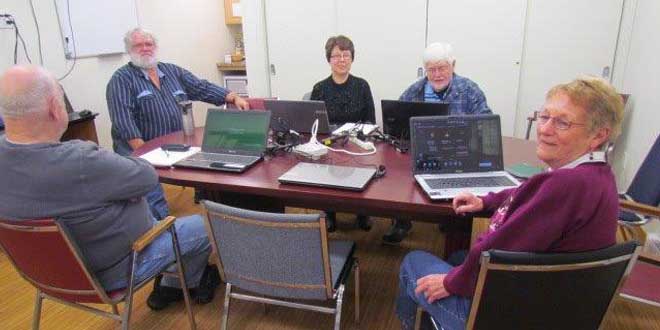 Pictured are participants in the free computer classes for seniors offered at the Mindemoya library including instructor Wes Cline, Carol and Bruce Lee, Joan Ralph and, with his back to the camera, Wayne Sanders.