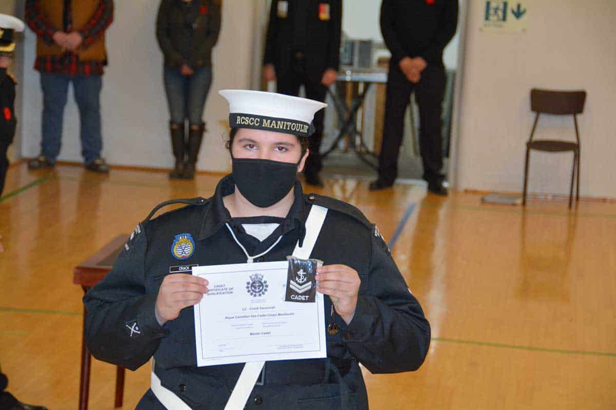 The Lieutenant Commander Roger Szydziak Outstanding First Year Cadet Award is for the demonstration of proficiency in dress, deportment and self-discipline: Congratulations LC Landon Aelick; Manitoulin Navy League Branch Outstanding Second Year Cadet Award is awarded for demonstration of proficiency in dress, deportment and self-discipline: Congratulations MC Cadet Rhys Allison; Outstanding Fourth Year Cadet Award is given for the demonstration of proficiency in dress, deportment and self-discipline: Congratulations PO1 Ryan Goddard; The Commanding Officer Outstanding Fifth Year Cadet Award is for top demonstration of proficiency in dress, deportment and self-discipline: Congratulations CPO2 Dayna Beauchamp; Most Improved Cadet Award is presented to the cadet who shows the most overall improvement in drill, dress and discipline: Congratulations MC Lydia Pennings.