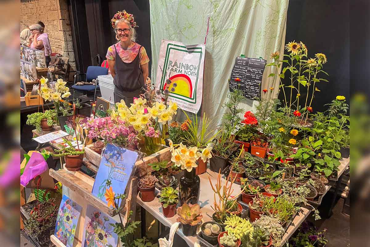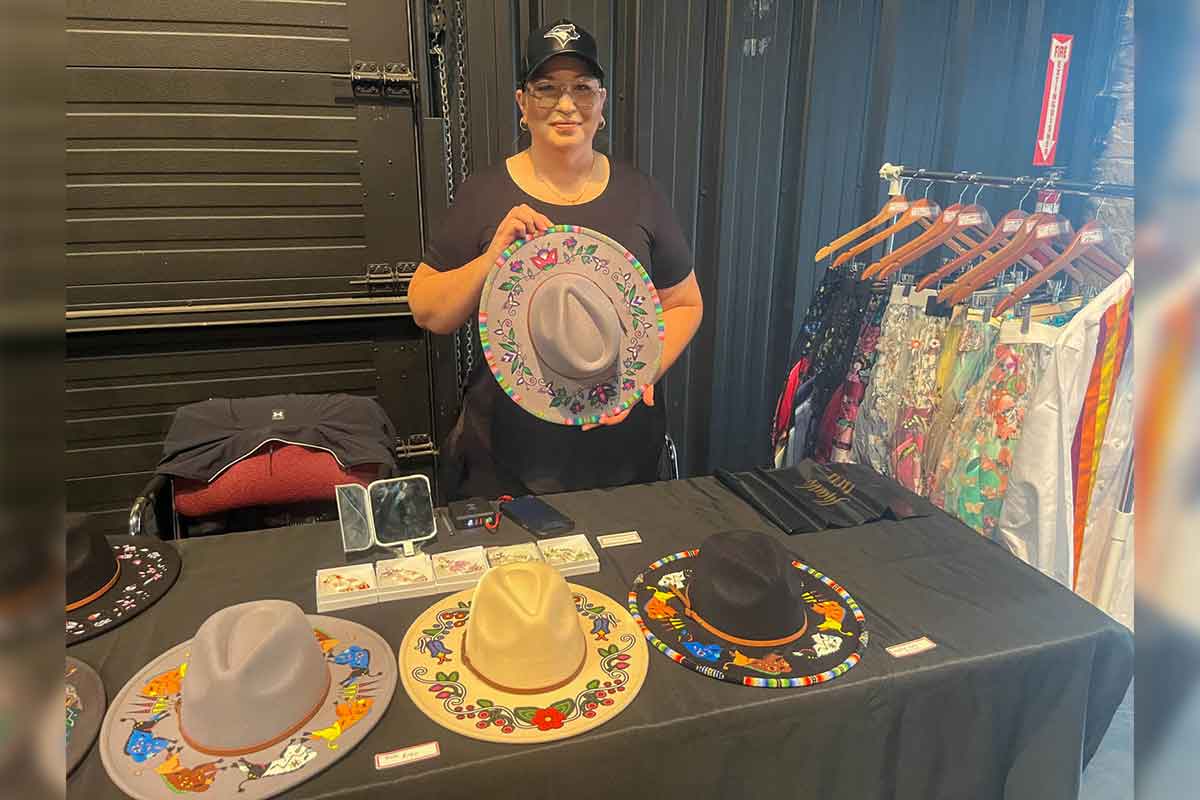 Rainbow Farm North’s Jenn Mezel stands behind a veritable field of flowery products during the Debajehmujig Storytellers Mother’s Day Market.Heather Manitowabi of Manitowabi designs poses with one of her beautifully decorated hats during the Debajehmujig Storytellers Mother’s Day Market.