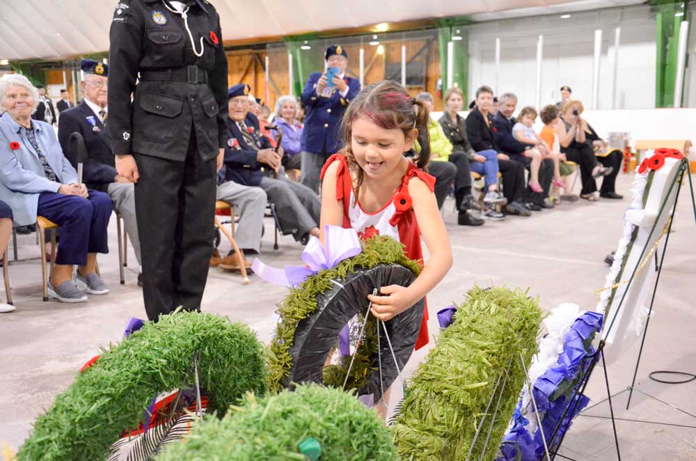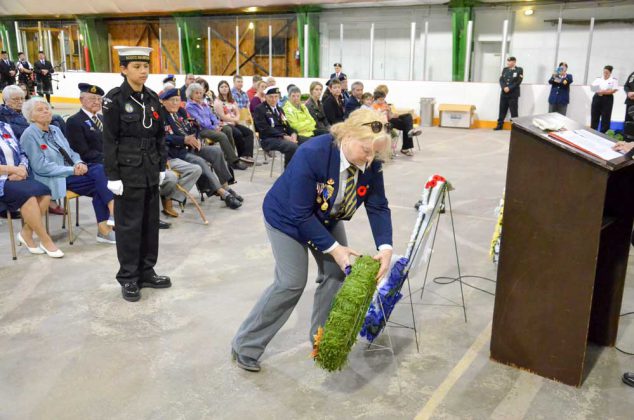 The wreath on behalf of Afghanistan Veterans was laid by past Branch 177 President Debbie Menard; Korea War Veterans by Corporal Kevin Smith; Peacekeepers by Lewis Jewell; Royal Canadian Legion Branch 177 by President Ruth Eadie; Little Current Royal Canadian Legion Branch 177 Ladies Auxiliary by Linda Bowerman; Gore Bay Royal Canadian Legion Branch 514 by President Carrie Lewis; Manitoulin North Shore Naval Veterans by President Bryan Chapelle with escort secretary treasurer Bill Ranich; Navy League Manitoulin President Bob Jewell laid the wreath on their behalf; Merchant Navy wreath was laid by Shipmate Bob Yrcha; Royal Canadian Sea Cadet Corps Manitoulin 348 wreath was laid by newly installed Corps Commander Naval Cadet Officer Sylvain Boucher; and on behalf of the Manitoulin-Espanola OPP Detachment and the UCCM Tribal Police Service retired Sgt. Don Watson; Municipality of Central Manitoulin by Mayor Richard Stephens (three of his father’s older brothers served overseas in the Second World War, returning safely home); Masons of Doric Lodge 455 Little Current was laid by Past District Deputy Grand Master Keith Legge; Sudbury Shrine Club President Dave Hodgins Escort Vice President Rob Fleming; Haweater Unit of the Sudbury Shrine Club by Nobles Ed Elchyshyn, Moe Keller and Ted Taylor; Little Current and Sheguiandah United Churches by Pastor Paul Allard; Children of Manitoulin by Sadie Hardy, granddaughter of President Carrie Lewis; Linda Bowerman in memory of Norman Lockyer; Mel Bowerman Jr. in memory of Mel Bowerman; Toots McDermid in memory of Hugh and John Bailey and an unidentified woman on behalf of Don Cada; and the Women’s Memorial wreath was laid by Leila Thureson.