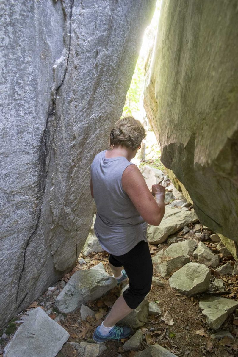 Following a pause for everyone to catch their breath and soak up the views on the spectacular sunny afternoon, the group decided to head down the back way off the mountain in a longer, gentler loop that returned just steps up the road from where the main entrance begins. That back trail wound through a brief rock tunnel and skirted the land where the former fire ranger’s cabin was once located back when a fire tower was still stationed atop Willisville Mountain.