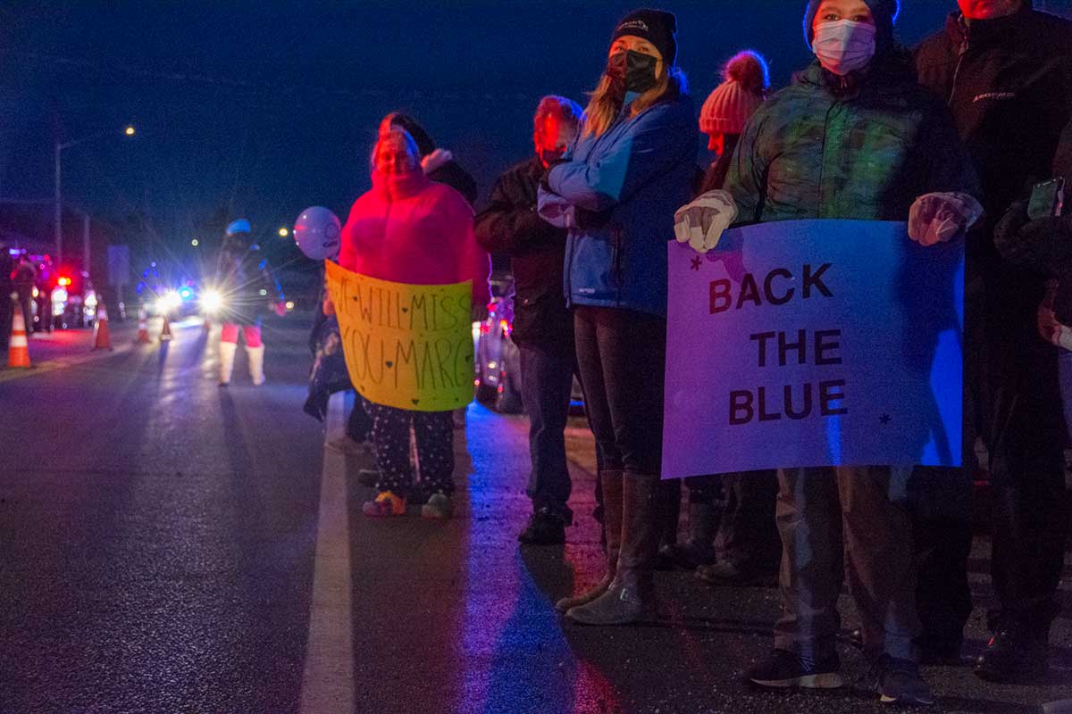 The Ontario Provincial Police (OPP) motorcade crossed the swing bridge onto Manitoulin Island at approximately 5:40 pm in a salute of lights and sirens, as the vehicles passed walls of people lining the roadside. Those gathered were largely dressed in blue and carried lights and signs in honour of the fallen officer.