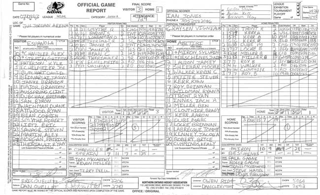 Strain stopped 25 of 26 to register the inaugural win for Espanola. Sylvain Miron faced 31 shots in a losing cause for the home side.
