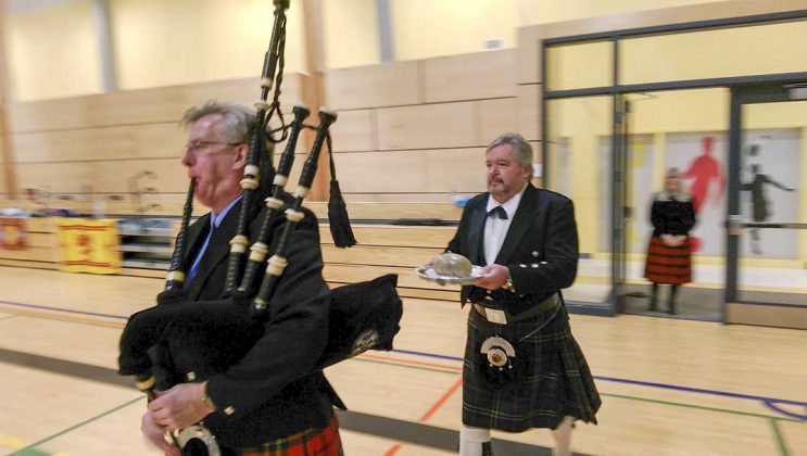 The evening’s festivities began with Piper David Beaton leading in the head table and then conducting the traditional marching in of the haggis, that Chieftain of the Pudding Race so celebrated in poem and Scottish lore.