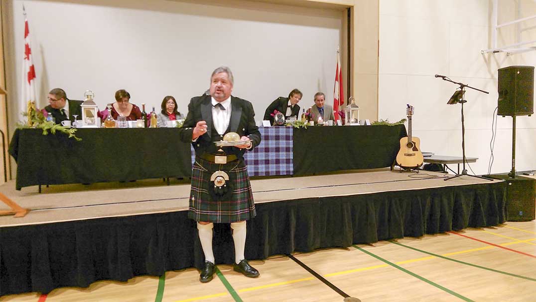 Mr. Andrews took the assembly through a brief history of Robbie Burns entitled ‘To the Immortal Memory of Robbie Burns,’ along the way debunking scurrilous rumours doubtlessly authoured and spread by jealous Sassannach. He noted that the workaholic bard not only worked on farms, in the coal mines and found time to create a massive body of work, but also managed to sire 22 children. “He came from the land and the plow,” said Mr. Andrews. “Which many of you can understand.” Mr. Andrews noted that Robbie Burns lived through both the American and French revolutions and, in a time before the advent of even daily newspapers, let alone radio, television or the Internet, he managed to stay incredibly well-informed on global affairs.