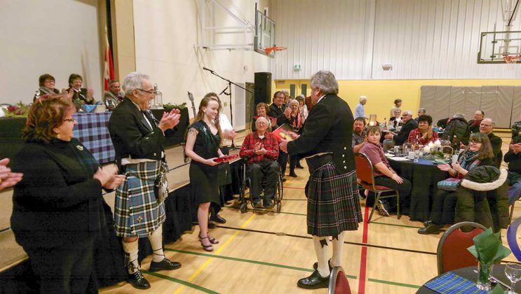 Following dinner, the Scottish evening festivities continued, with Mr. Beaton delivering well received pipe solos, a Burns poem recited by Mr. Andrews, a musical interlude of Scottish songs by George Williamson on guitar and, as a special nod to Manitoulin’s connection to Robbie Burns, a reading of the Burns’ poem ‘Epigram to Miss Ainslie at Church’ by Pastor Thompson.