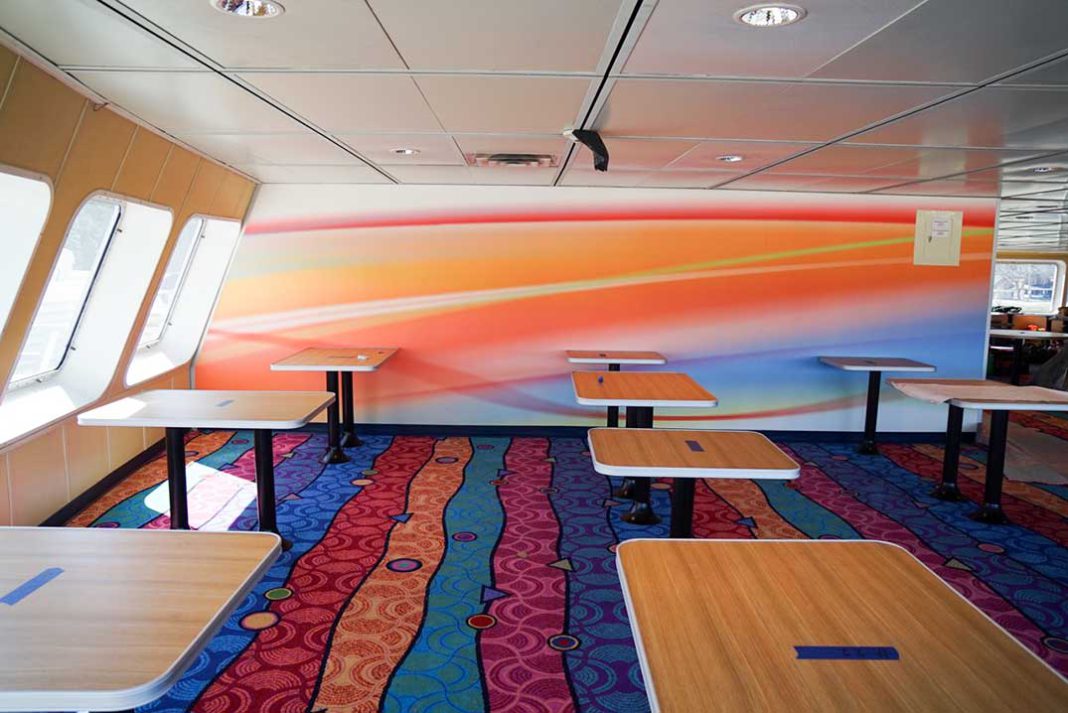 The dining room has seen a major upgrade, the first real change in 40 years. “We took the dining room right back to the studs,” noted Ms. Schrempf. “There is a lot of colour and the scenes inside reflect the ship outside.”