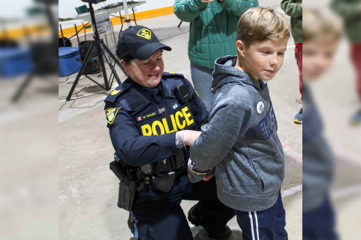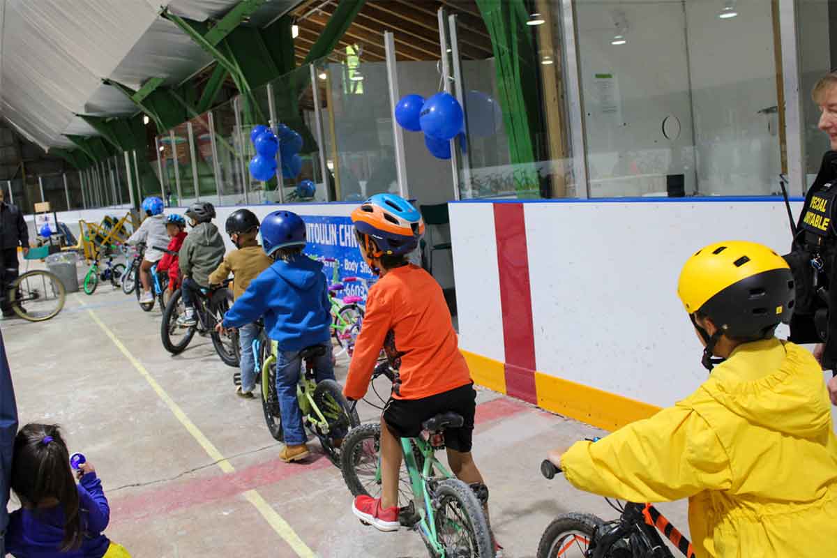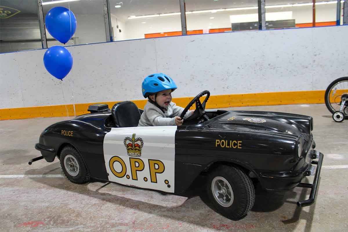 MINDEMOYA—On Saturday, September 6 the Mindemoya arena buzzed with conversation as bikes whizzed by in all directions. From toddlers to teens, everyone was either riding or pushing a bike around the large space. Fifty-four youth had registered, though not all showed up. Still, an impressive number came out to ride bikes and learn. There were police officers, special constables and auxiliary members in full force. Some were aiding in the programs, dividing the kids into age categories, with bike safety being the main focus in all groups. Some were manning the tables that offered all kinds of swag – kites, frisbees (that changed colour outdoors), boomerangs, markers and cool lights to clip on your backpack, or your bike.